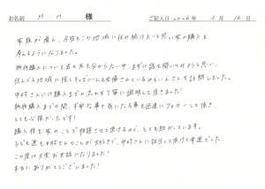 物件購入までの間、不安な事や気になることも迅速にフォローして頂き、とても心強かったです!購入後も家のことで相談させて頂けるので、とても助かってます!2026年3月20日|M様 年齢:30代・家族構成:4人