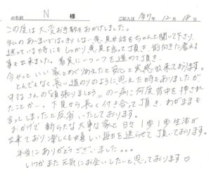 中村さんの「頑張りましょう」の一声に何度背中を押されたことか…今やっといい家とめぐりあえたと安心と実感出来ております!楽しくも嬉しい毎日を送らせて頂いております♡2026年3月20日|N様 年齢:50代・家族構成:2人