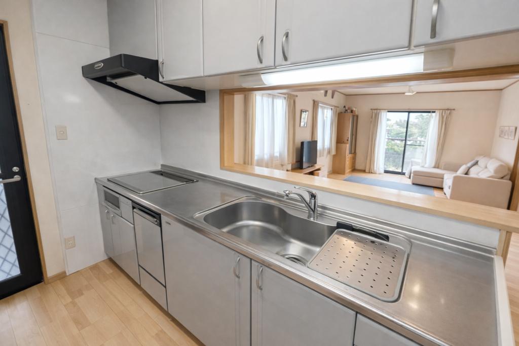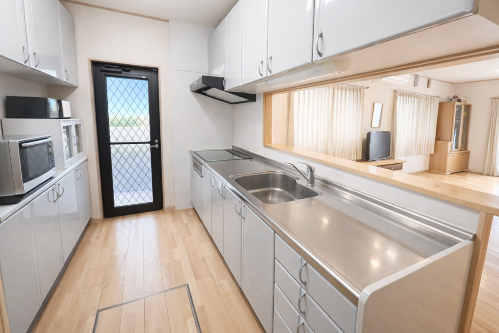 対面式キッチン IHクッキングヒーター 食器洗浄乾燥機 床下収納 勝手口 追炊き 浴室暖房乾燥機 シャワー付洗面台 洗面所に窓 バルコニー 庭
