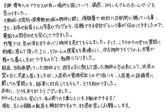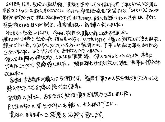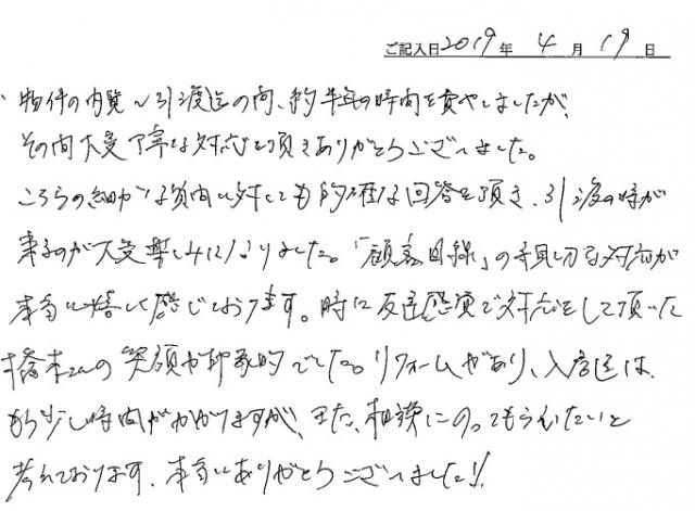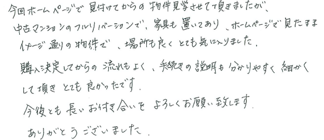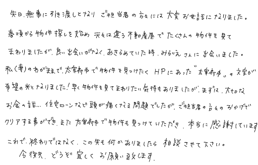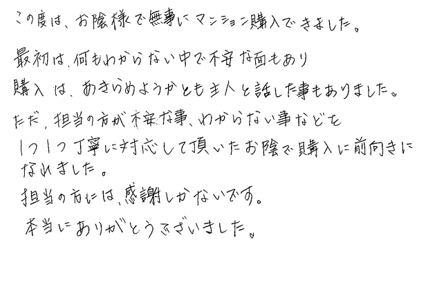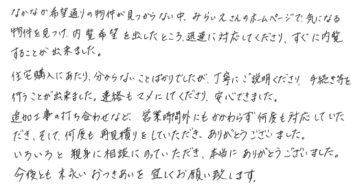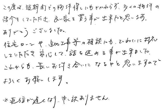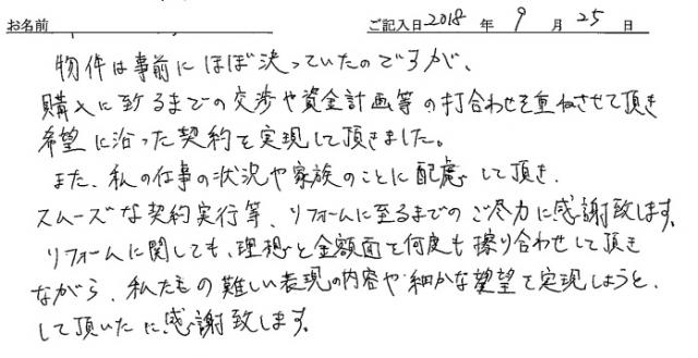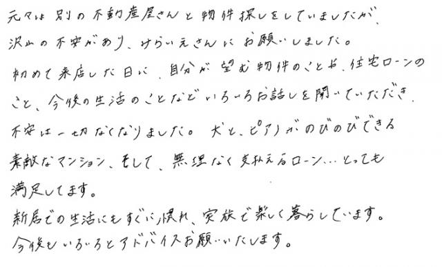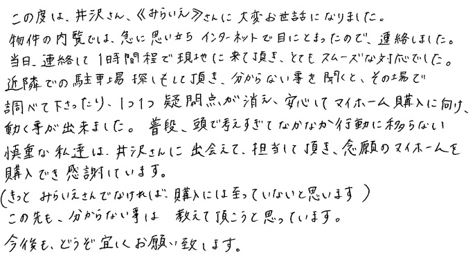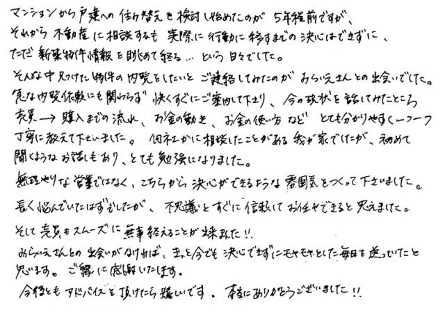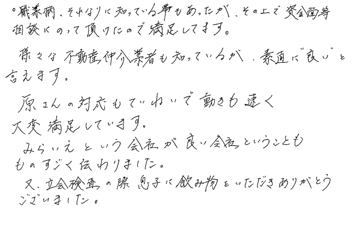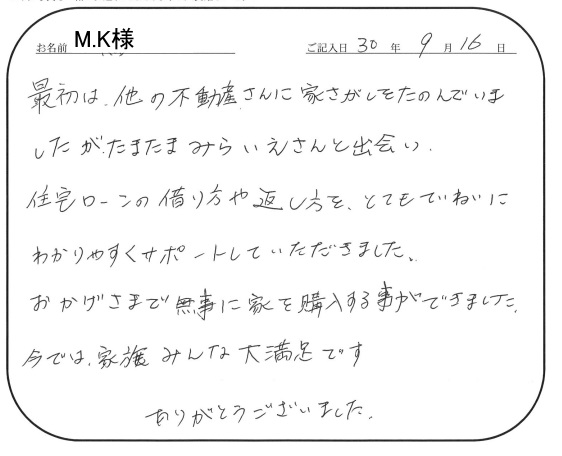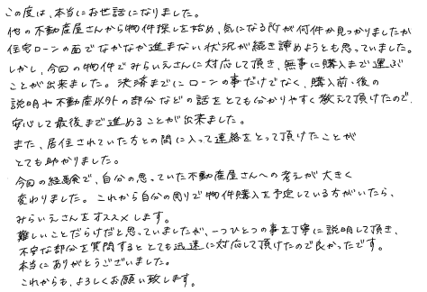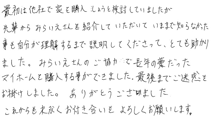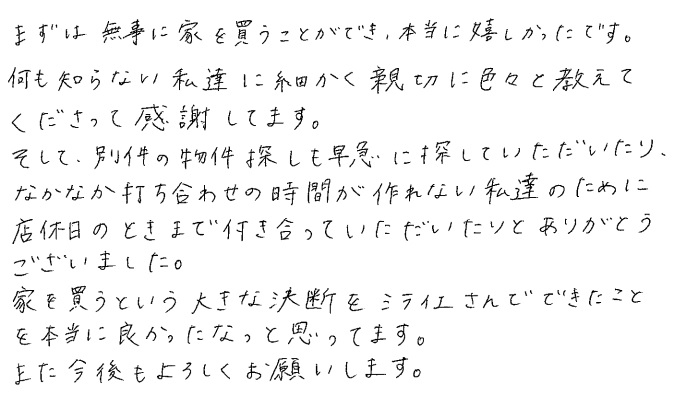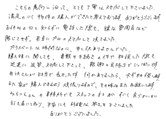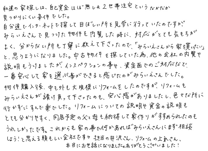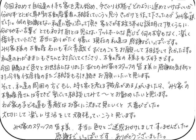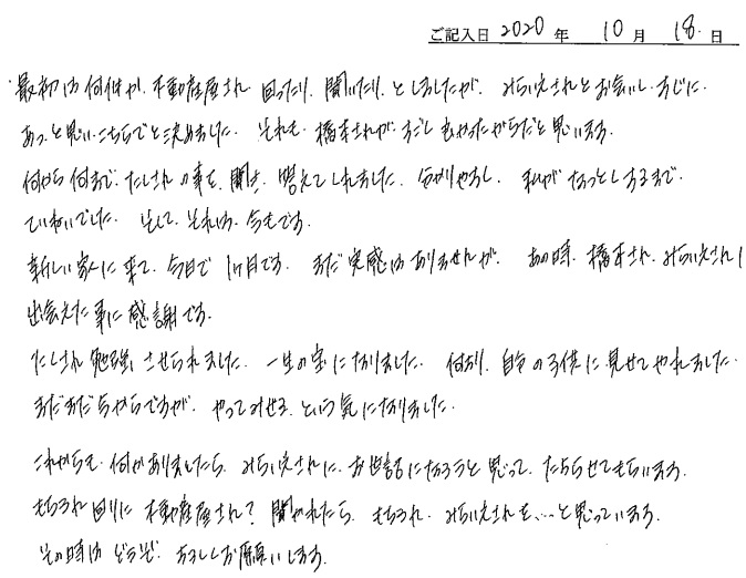 連絡もマメにしてくださり安心できました2020年 10月 20日 | <p>W.S様</p><p>年代:30代</p><p>家族構成:3人家族</p>